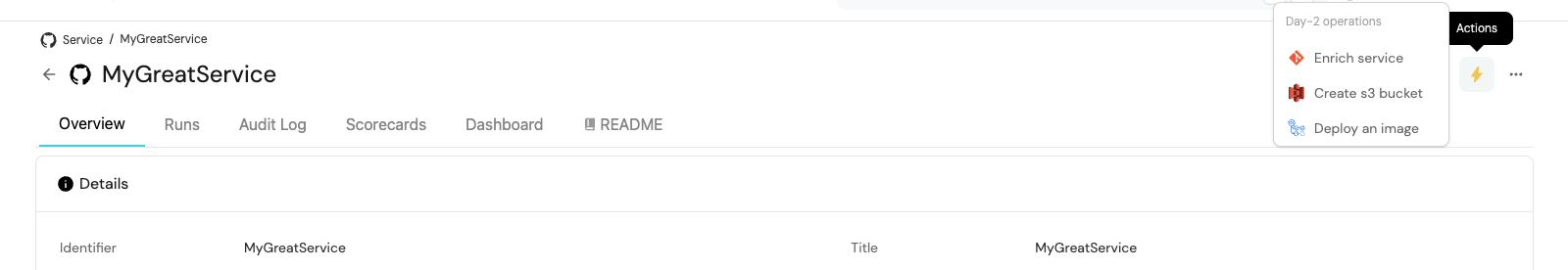 For example, the following page of an entity of type service displays a list of actions that can be executed on that entity: