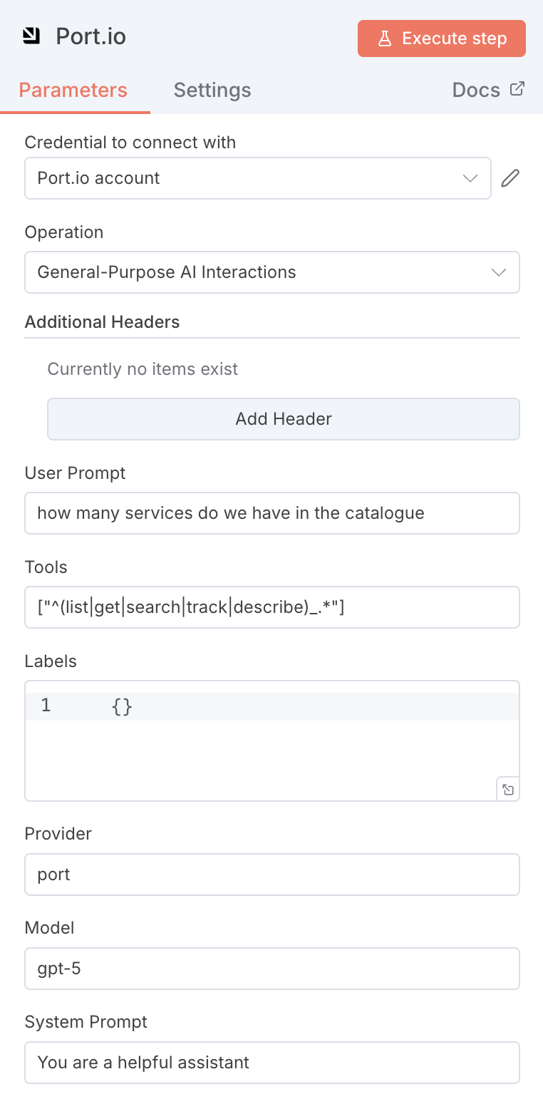 1. Configure the Port node — In the General Purpose AI Interaction node: