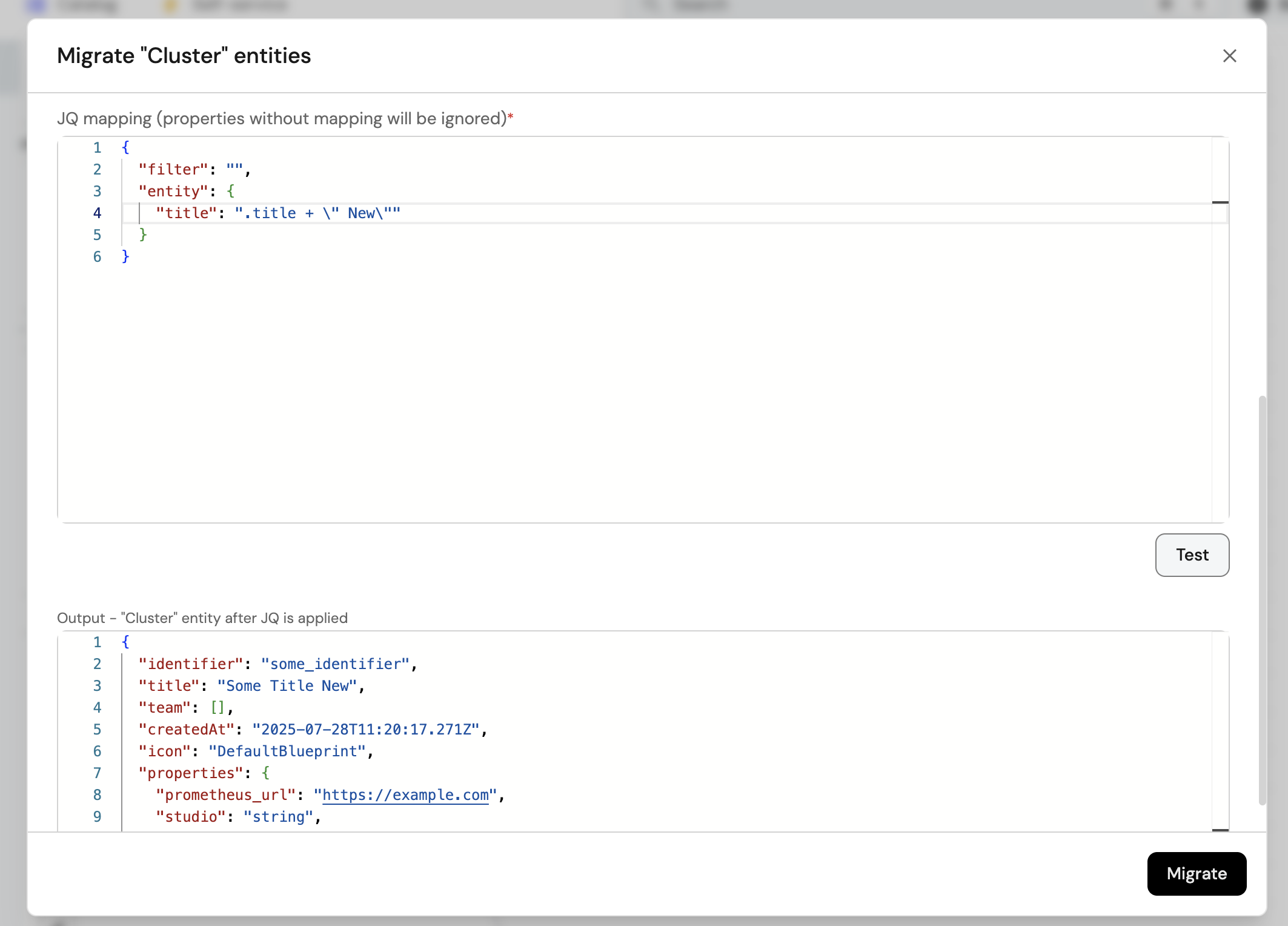 Before executing the migration, you can review a summary of the planned changes. This includes a preview of how entities will look after migration, allowing you to verify that all mappings are correct and JQ checks out.