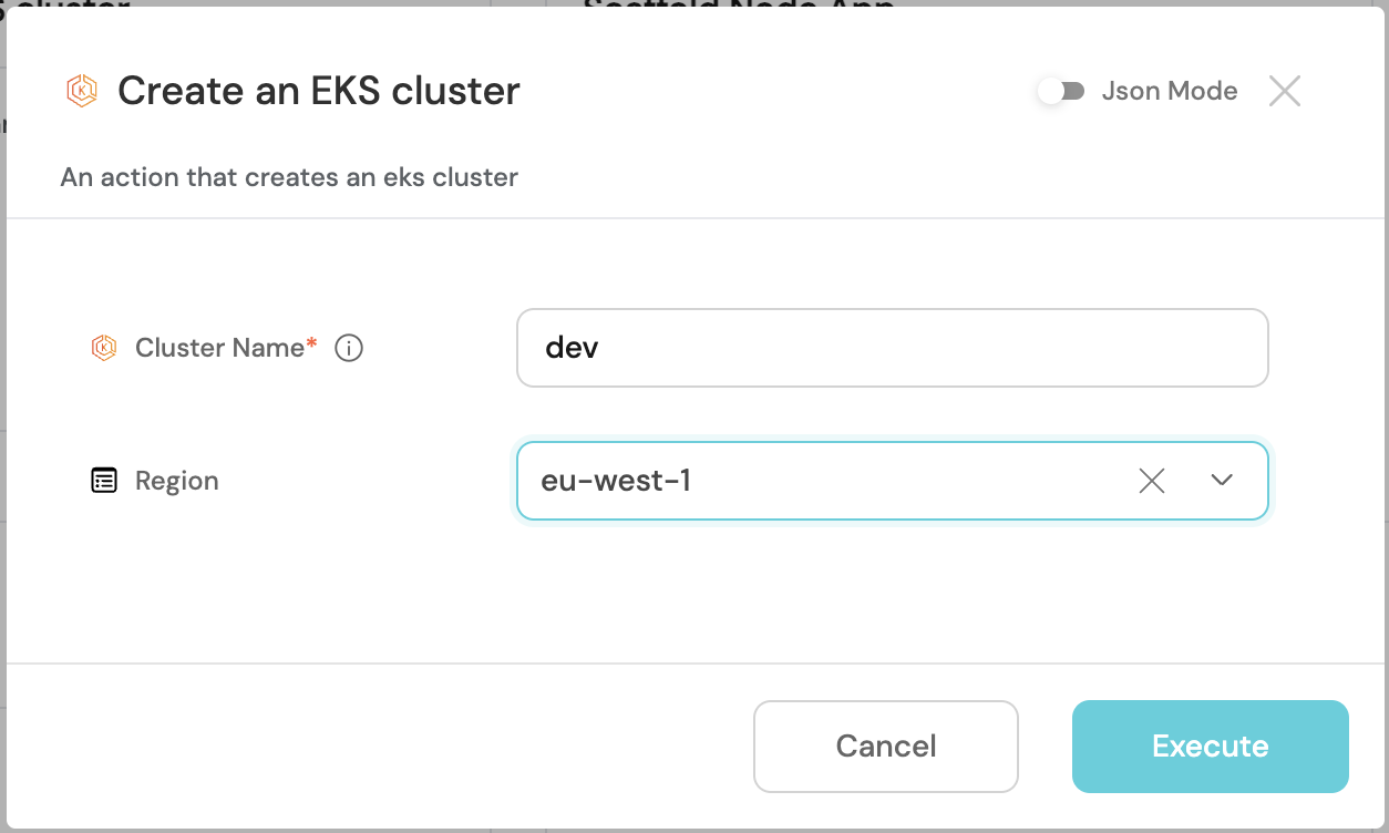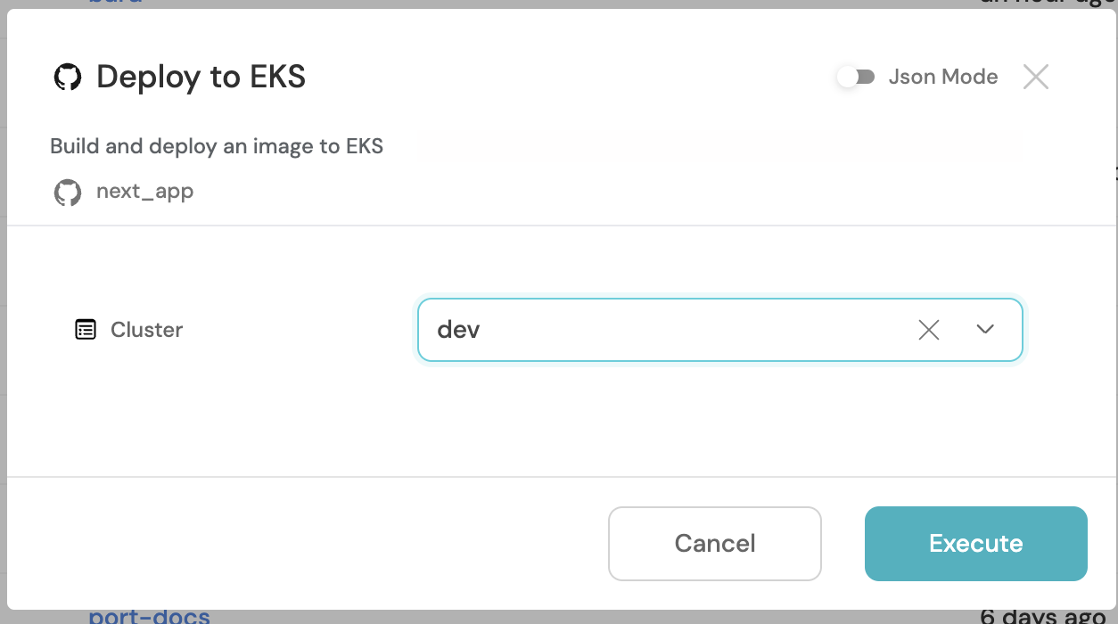 1. On the self-service page, create a Port action against the Repository blueprint called Deploy to EKS.