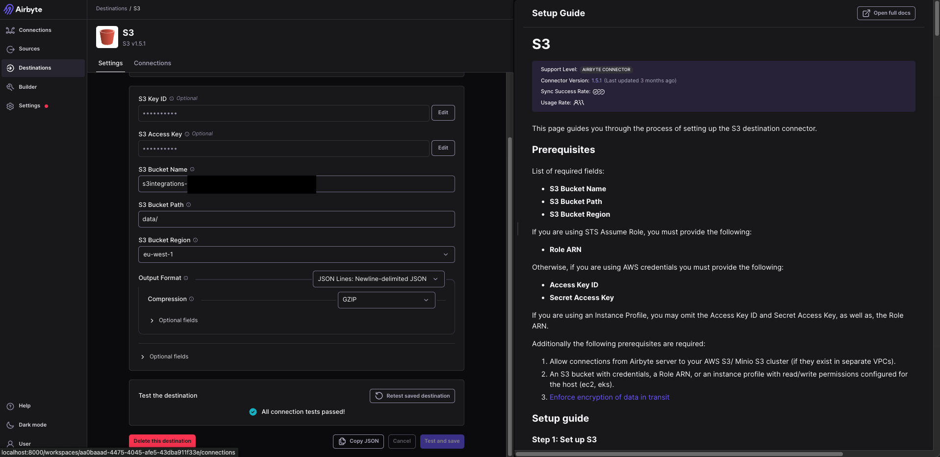 Test and saveand wait for Airbyte to confirm the Destination is set up correctly.