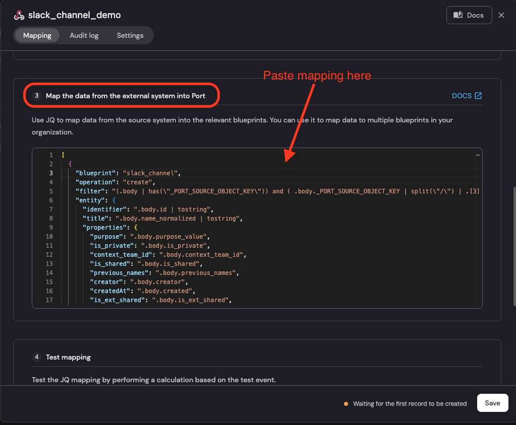 Scroll down to the section titled "Map the data from the external system into Port" and paste the following mapping:
