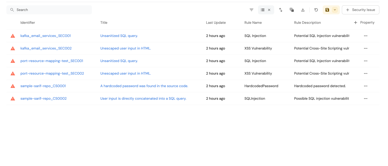 Once you have configured the data source and mappings, the extracted security issues will appear in the Port UI with properties like rule name, description, location, and message. Here’s an example SARIF file structure that you can copy and replicate for testing purposes: