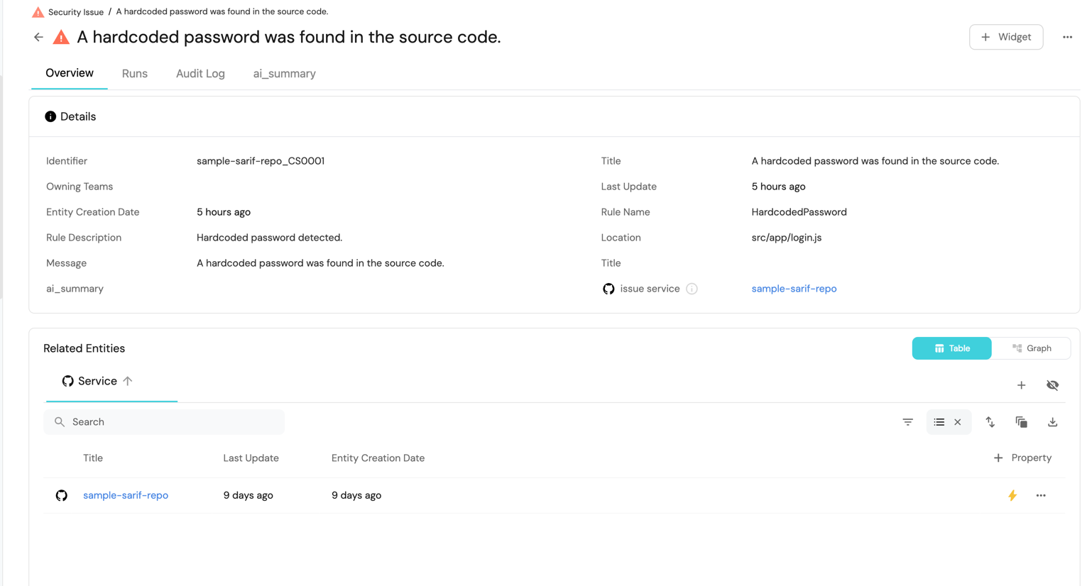 By following these steps, you can effectively ingest security issues from .sarif files and relate them to the corresponding service entities in Port πŸŽ‰.