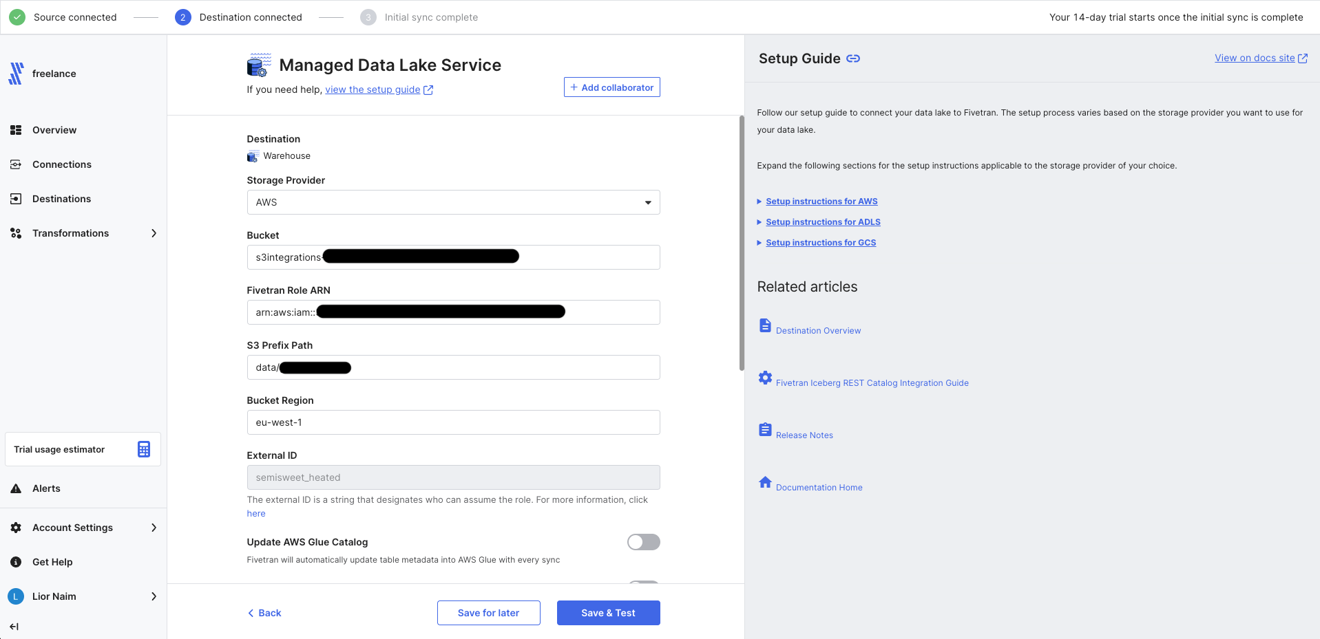 1. In order to configure your Fivetran ARN Role, you will need to provide us the "External ID" that Fivetran will produce in the UI when configuring the S3 destinstaion. For that purpose, you can start creating the Destination, copy the External ID value, and Click on "Save for later". You can resume the Destination setup once the rest of the details will be provided by Port.