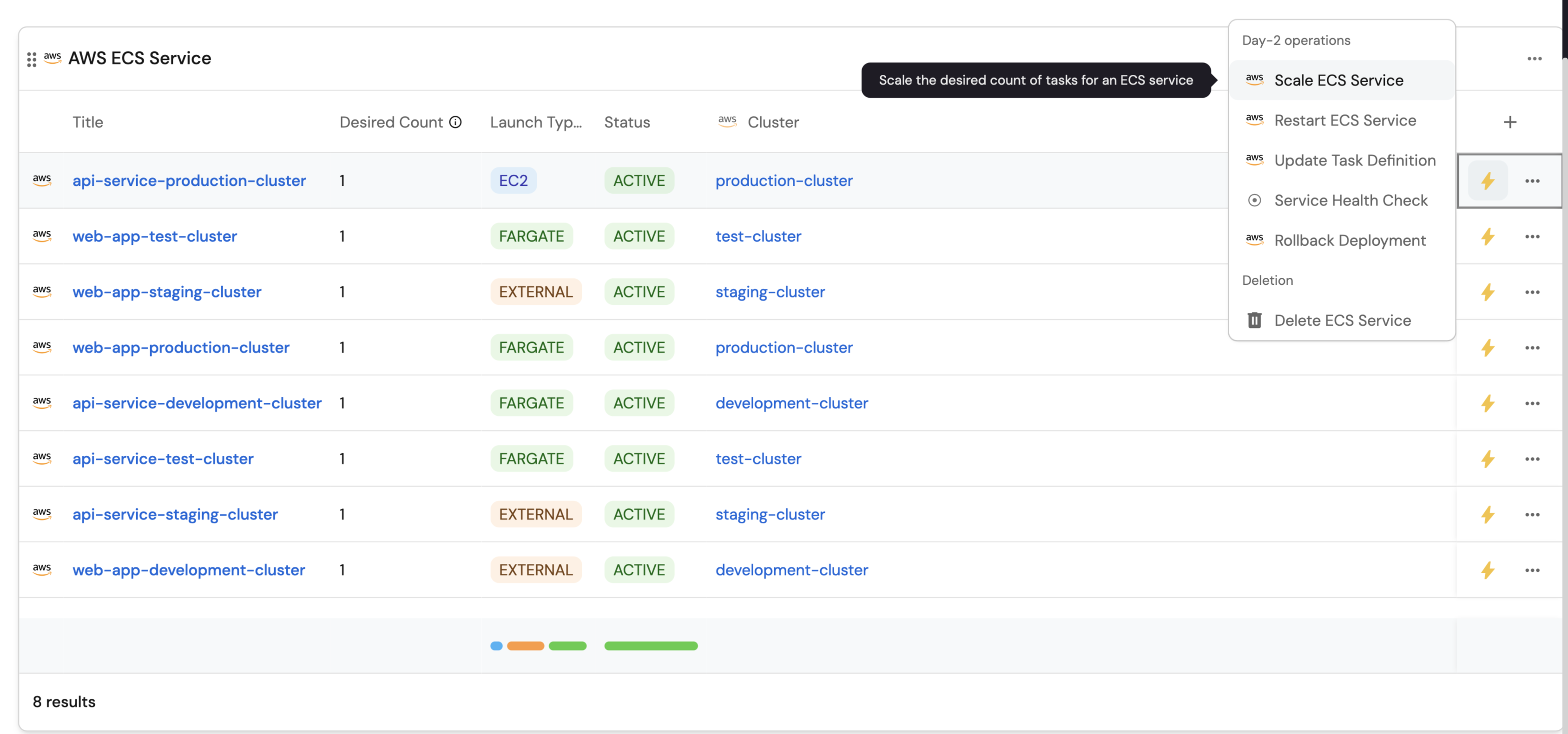 • Set up self-service actions to manage ECS services (scale, restart, deploy, health check, rollback, and delete).