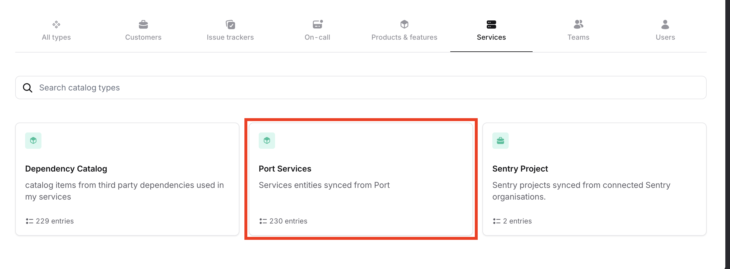 • You should now see the synced service entities from Port listed under this catalog type.